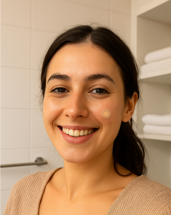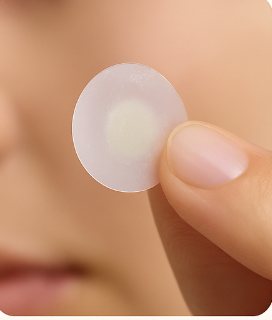 Dopo una notte con il nostro cerotto anti-acne idrocolloide, la pelle è lenita, il brufolo piatto e quasi invisibile.