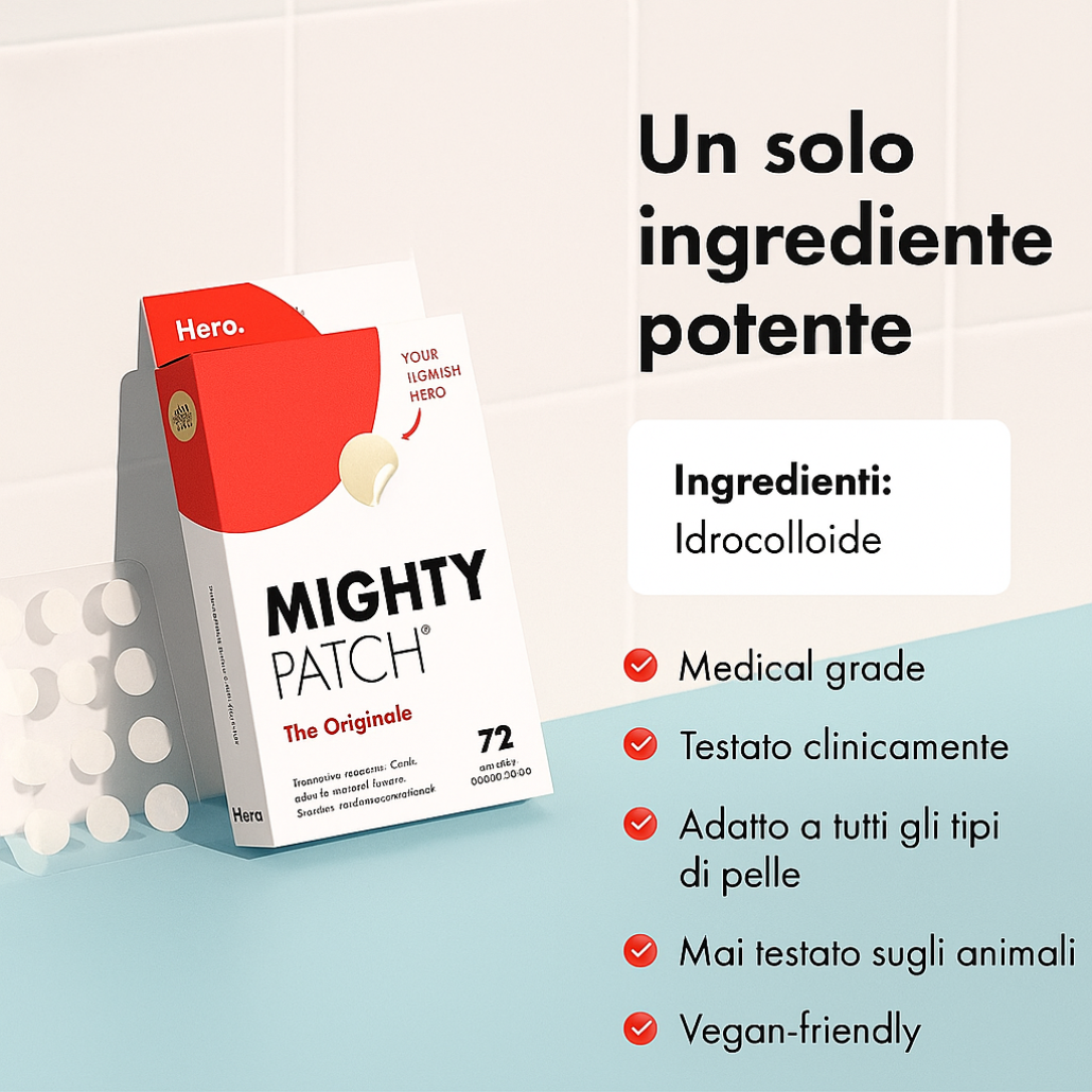 Un brufolo? HERO al salvataggio! Il MIGHTY PATCH™ Cleista è realizzato in idrocolloide di grado medico, HERO è il marchio n°1 dei cerotti anti-acne*. Il cerotto anti-acne notturno assorbe delicatamente le impurità dai brufoli in appena 6 ore (così facile che puoi letteralmente farlo dormendo) per svegliarti con una pelle più chiara al mattino.*Mercato dei cerotti anti-acne in unità vendute: IQVia (Farmacia + Parafarmacia) / Stackline (Amazon) / IRI Circana (HMSM) – CAM Giugno 2025